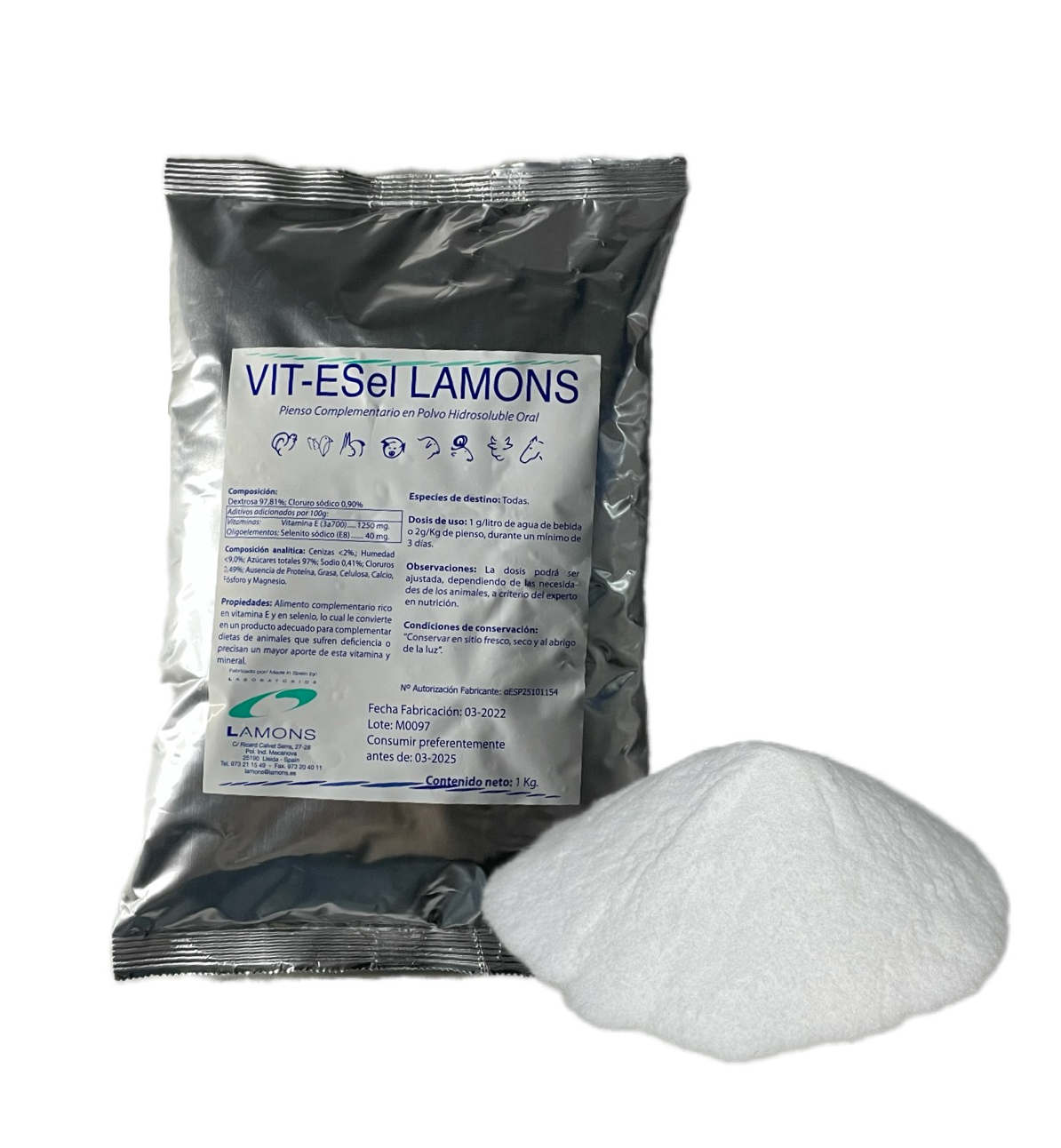VIT-ESel Lamons Polvo es un alimento complementario rico en vitamina E y en selenio. La vitamina E es un antioxidante natural u su efecto se ve potenciado por la presencia de selenio, lo cual le convierte en un producto adecuado para complementar dietas de animales que sufren o se hallan en peligro de sufrir encefalomalacia, distrofia muscular, infertilidad o acumulaciones grasas en hígado.